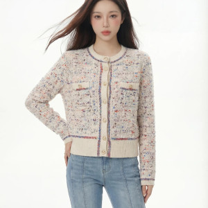 신상품 샤넬풍 양모 혼방 가짜 스팽글 공예 니트 가디건입니다. 고급스러운 질감과 섬세하고 촘촘한 니트 텍스처가 특징입니다. 아름다운 컬러 원사 배합으로 정교하고 세련된 분위기를 연출하며, 우아한 매력과 현대적인 패션 감각이 어우러져 달콤하면서도 멋스러운 스타일을 완성합니다. 한 눈에 반할 만큼 매력적인 여성 필수 아이템입니다. 컬러: 아이보리, 블루 / 사이즈: S, M, L