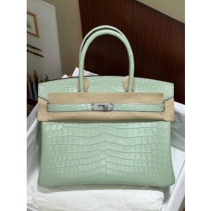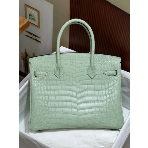 플래티넘급 30cm 사이즈의 민트그린 실버 버클 핸드백입니다. 수입 매트 나일 크로커다일 가죽을 사용하여 최고급 수작업으로 제작되었습니다. 전문 매장과 동일한 퀄리티로 현품 출고 가능하며, 전체 수공예 제작 방식을 적용한 프리미엄 제품입니다.
